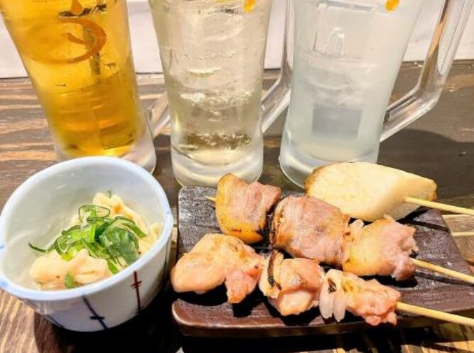 立パラを語る上で欠かせないのが、時間限定で提供される「せんべろセット」です。アルコール2杯(生ビール含む)+おつまみ1品+串焼き3本で1,000円(税込)という圧倒的なコスパ。「千円でドリンク2杯と肴付き」というまさに「パラダイス」の名にふさわしいセットで、ほとんどの初来店客がこれを注文します。このセットでサクッと楽しんで、追加でこだわりの一品を頼むのが立パラ流の楽しみ方です。