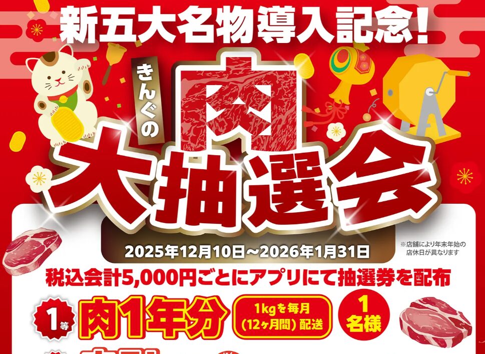 この冬は、焼肉きんぐの「五大名物」を頬張りながら、抽選券をゲットし、ぜひ1等の「肉1年分生活」を目指してみてください!