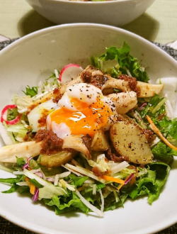 温泉卵を割って濃厚なソースに絡めると、さらにリッチな味わいに!野菜がたっぷり摂れるので、罪悪感なく美味しくいただけます。休日のブランチにも最適です。