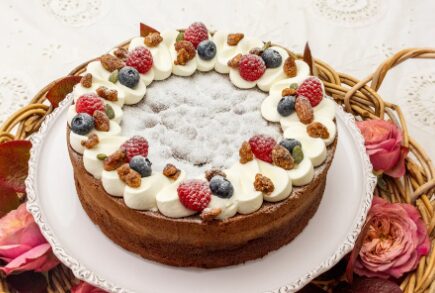 しっとりとした味わいのチョコレートケーキにクリームを飾ったクリスマスにぴったりのケーキ。甘酸っぱいフルーツとナッツが相性抜群です♪