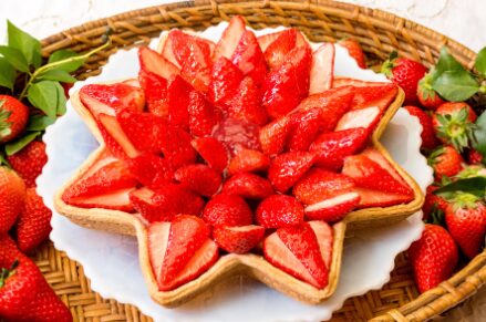 何といっても目を惹くのが星形のタルト。そこにぜいたくにたっぷりのいちごを飾っています。サワークリーム入りのホワイトチョコカスタードに自家製ジャムを加えていて、イチゴ好きにはたまらないタルトに仕上がっています♪