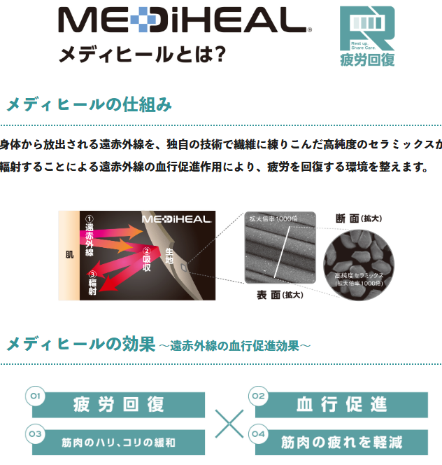 つまりメディヒールは、「体温」という自然のエネルギーを利用して、全身の巡りを促し、疲労回復をサポートする画期的なパジャマ(ルームウェア)なのです。