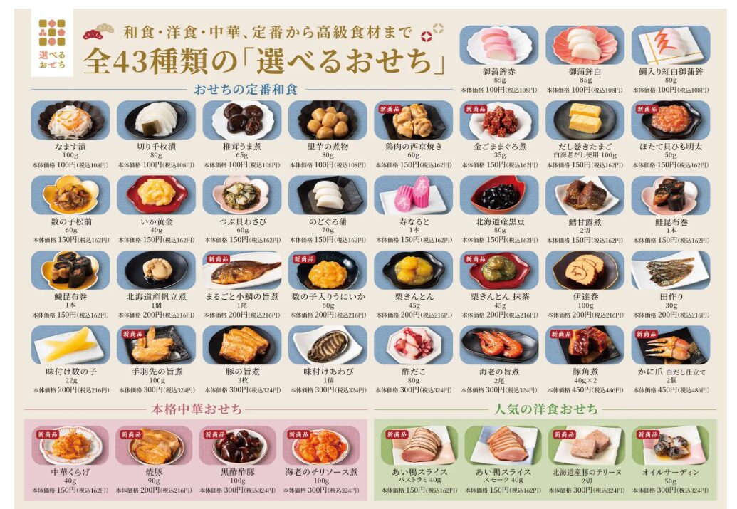 これまでは「100円おせち」として有名でしたが、今年は名称が「選べるおせち」に変わりました。 物価高が気になる今だからこそ、必要な分だけを賢く選べるのが嬉しいですよね。気になるラインナップと価格は以下の通りです!