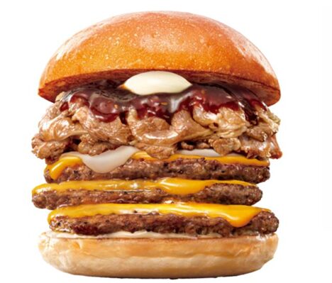 「ダブル絶品チーズ牛カルビバーガー」の牛肉100%のパティと、レッドチェダーチーズをそれぞれ3枚に増量したトリプルサイズのボリューム満点なバーガーです。パティ3枚、チーズ3枚。一口では到底かぶりつけない厚みと、溢れ出す肉汁、そしてとろけるゴーダ&チェダーチーズのハーモニーが、脳を突き抜ける満足感を与えてくれます。