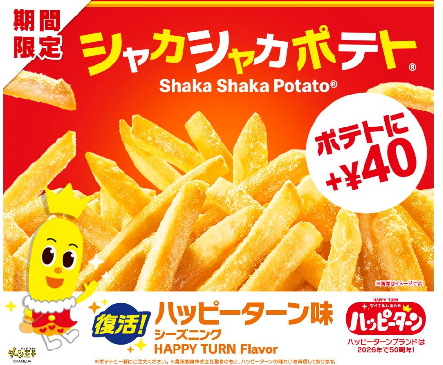 2026年12月29日(月)から登場したのは、なんと国民的お菓子「ハッピーターン」との夢のコラボ!あの“魔法の粉”がポテトになったら……想像するだけでヨダレが出てしまいます。実はこの「ハッピーターン味」は2024年に史上初となる企業コラボ商品として登場し、大きな反響を呼んだフレーバー。