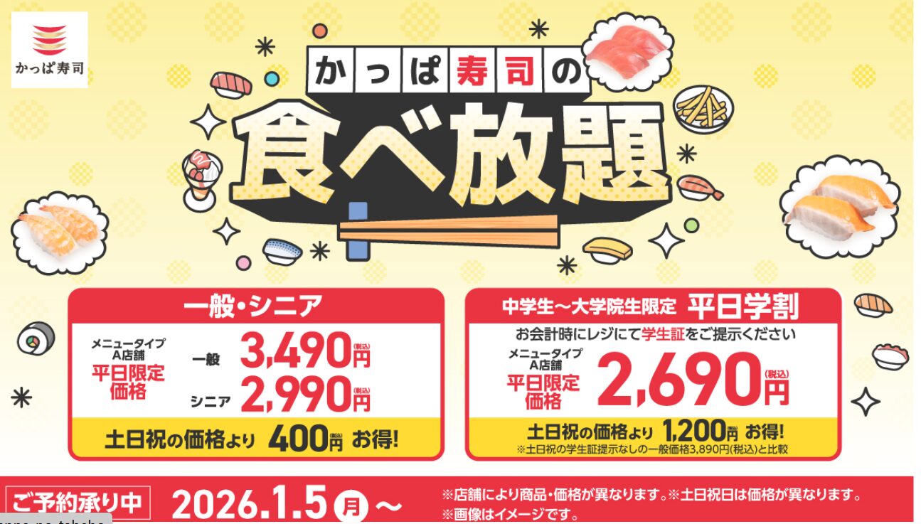 2026年1月5日(月)より、かっぱ寿司が全店舗にて「新年のごちそう初め」として、待望の食べ放題キャンペーンをスタートさせました。これまで一部店舗限定や期間限定で実施されるたびに、予約が殺到してなかなか取れなかった「かっぱの食べホー」が、満を持して全国展開です。