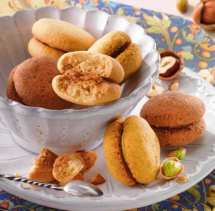 「貴婦人のキス」という意味を持つ、コロンとした見た目が可愛いイタリアの伝統クッキーです。しっとり、ほろほろとした食感のプチクッキーで、濃厚なナッツペースト入りのチョコレートクリームをサンド。ピスタチオ、アーモンド、ヘーゼルの3種類がセットになっています。
