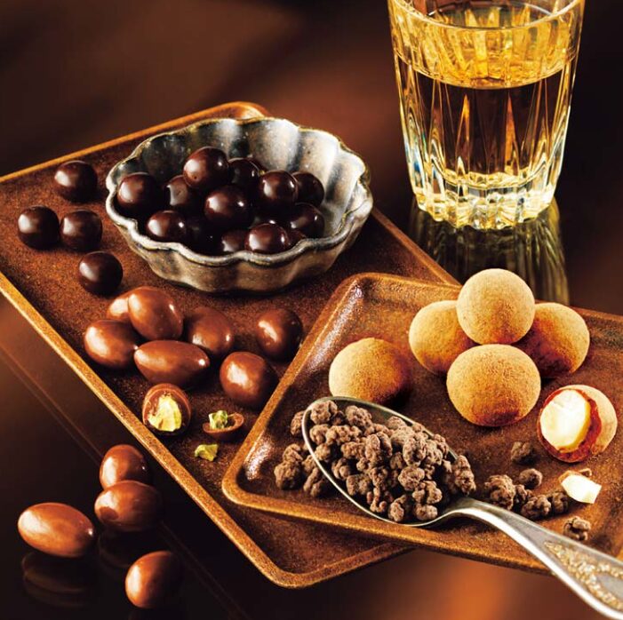 見た目も非常に美しく、1箱で「旅をするような感覚」でお酒を堪能できます。ラムレーズンが入ったものや、表面にチョコフレークをまぶしたものなど、食感のバリエーションも豊かです。