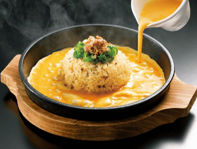 熱々の鉄板にのったチャーハンの周りに、店員さんが目の前で溶き卵を回し入れてくれるパフォーマンスが大人気!