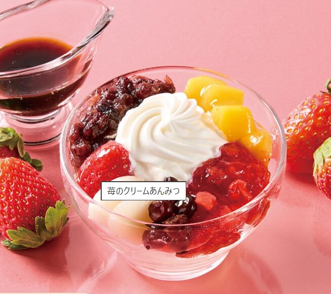 シャトレーゼのあんみつシリーズは、素材の鮮度とボリューム感で定評がありますが、この時期限定の「いちご」は、彩りの美しさと和洋折衷の贅沢感が格別。