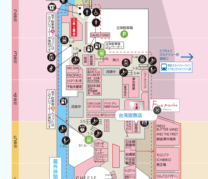 東京ソラマチの2階は非常に広いですが、「4番地」は押上駅(スカイツリー前駅)側に位置しています。地下鉄「押上駅」の改札を出てすぐの、ソラマチ地下3階入り口からエスカレーターで2階へ!上がった場所が「3番地〜4番地」付近です。4番地には、大きなスーパーマーケットの「リザーブ(北野エース)」や、お惣菜の「RF1」、お肉の「ニュー・クイック」がありますので目印に。