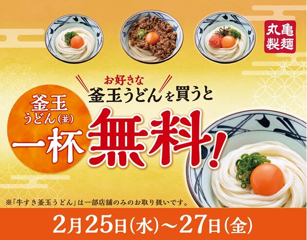 2026年2月25日から3日間限定で、対象の釜玉うどんを1杯注文すると「釜玉うどん(並)」がもう1杯無料でもらえるキャンペーンが実施されます。