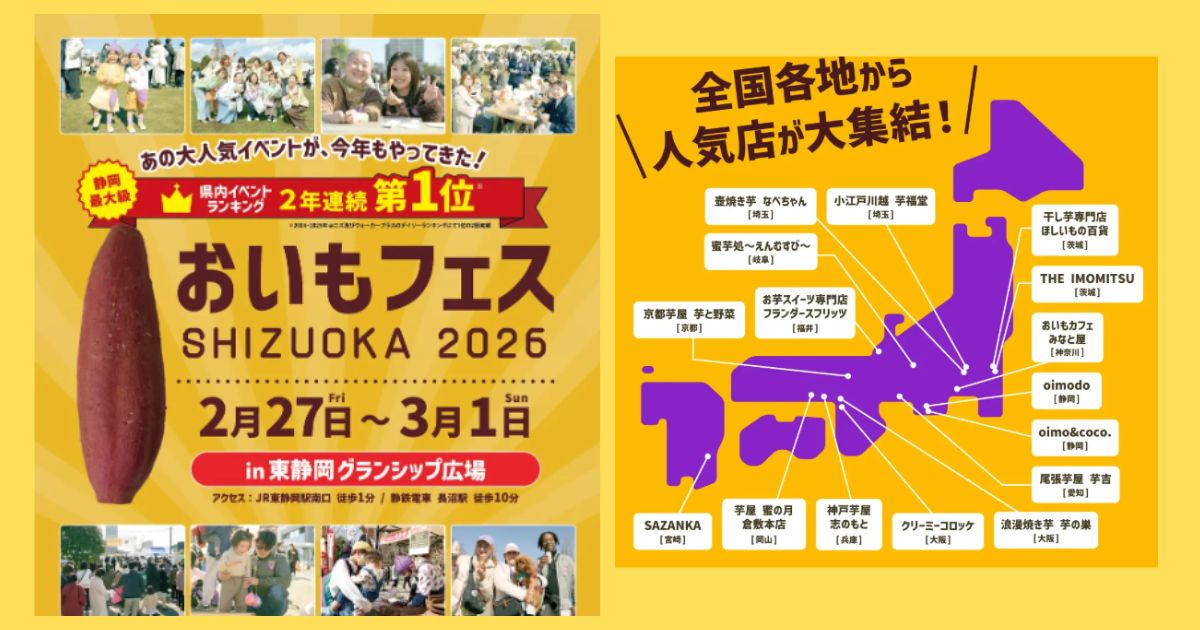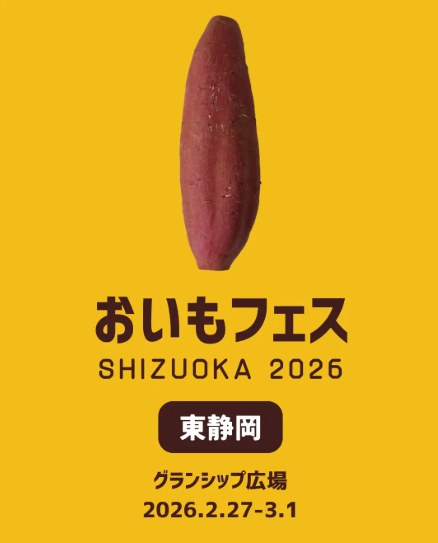 2026年2月27日(金)から3日間、JR東静岡駅すぐのグランシップ広場で「おいもフェス SHIZUOKA 2026 & しぞ〜かEXPO」が開催されます。