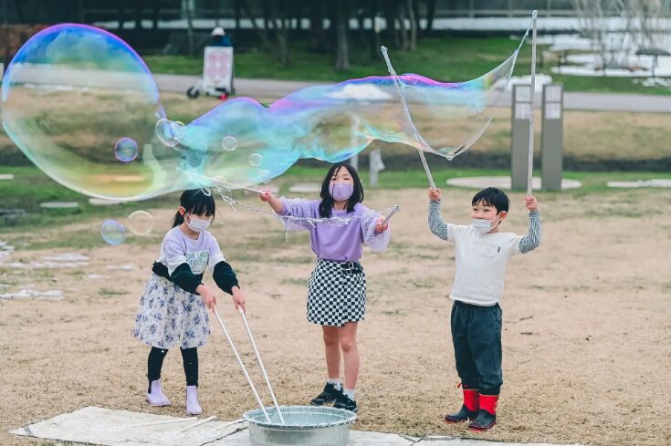 芝生広場を活かした開放的なスペースに、親子でゆったり過ごせる場所が用意されています。シャボン玉エリアでは、広い空の下でシャボン玉を追いかけられる、子供たちに大人気のスポット。絵本エリアは「食」や「おいも」にまつわる絵本が並び、座って読み聞かせを楽しめます。シール交換会は土日の15時から開催。お友達やスタッフとシールを交換して交流する、ほっこりするイベントです。